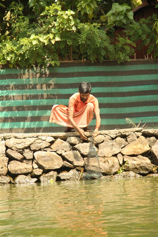 In der früh um 8:30 Uhr wurden wir mit einem Tuk-Tuk zum Anlegeplatz gebracht. Mit uns dabei waren noch 6 andere Personen, also quasi 2 Boote. Von dort aus ging es erstmal zum zweiten Guesthouse unseres Vermieter, wo es ein landestypischen Frühstück gab: puttu (gedämpftes Reispulver mit Kokos und Currysoße). Sehr gewöhnungsbedürftig, ist auch mehr Thilo`s Geschmack als Katharina`s ;-). Danach stiegen wir erneut in die Boote und paddelten zuerst durch die größeren Kanäle. Von dort aus hat man einen super Ausblick bzw. Einblick in die endlosen Hausboote. Aufgereiht wie Perlenketten säumten sie das Ufer. Im gemächlichen Tempo ging es dann über einen See in die kleineren Kanäle. Wir bekamen einen wundervollen Einblick in den Alltag der Menschen am Fluss. Dort wird die Wäsche gewaschen, es wird gebadet, gefischt, nach Muscheln getaucht, abgespült. Dabei herrschte absolute Stille. Kein Hupen, keine Autos waren zu hören. Ab und zu kam mal ein Motorboot vorbei, aber das war es dann auch schon. Die Landschaft der Backwaters ist atemberaubend. Unzählige Palmen zieren die Ufer, alles ist grün. Ihr seht es ja auf den Bildern